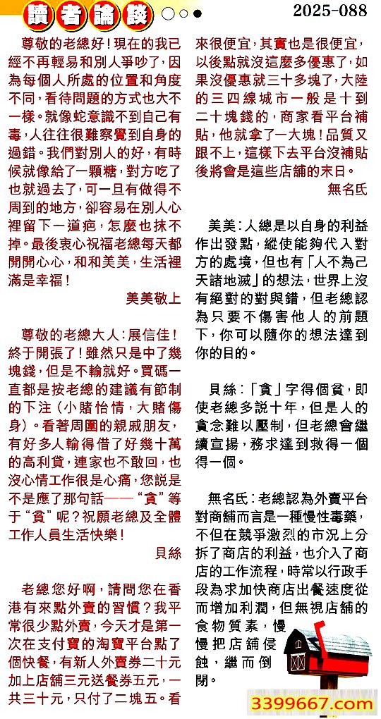 | 主题 :088期:彩民推荐〖貼信讀者論壇〗 |