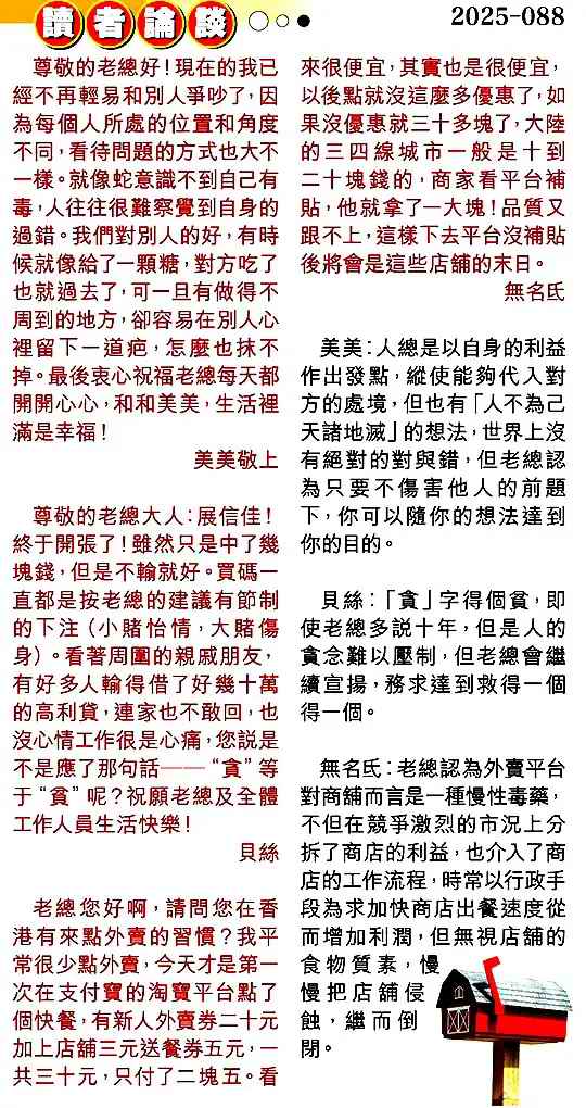 | 主题 :088期:彩民推荐贴信读者论坛 |