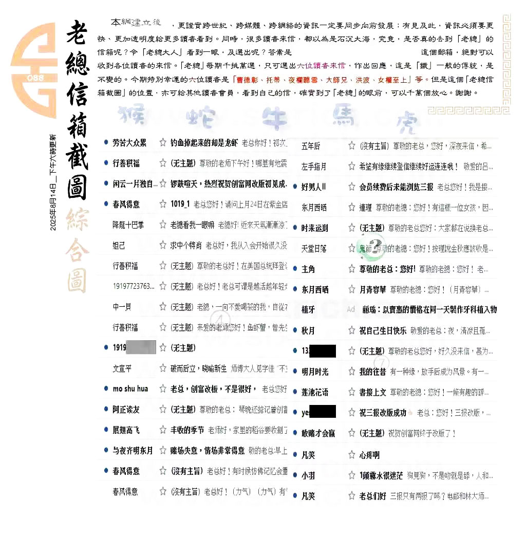 | 主题 :088期:六合皇金句/老总论码/萧公子/林大师/五行夺码/老总信箱截 |