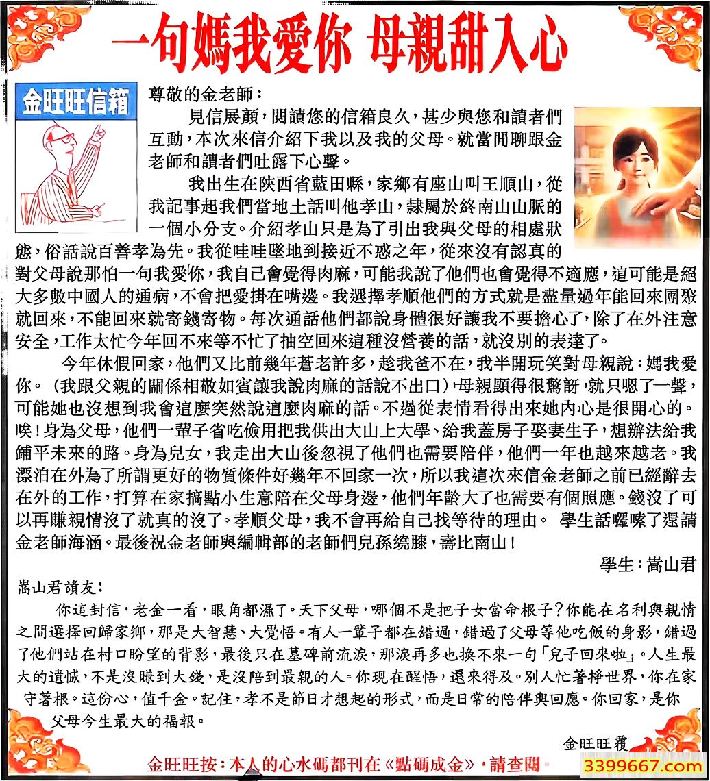 | 主题 :100期:金旺旺信箱彩民推荐→→《一句媽我愛你 母親甜入心》 |