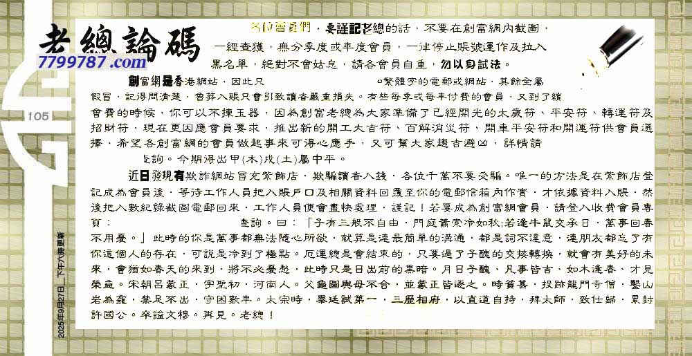 105期:六合皇金句/老总论码/萧公子/林大师/五行夺码/老总信箱截