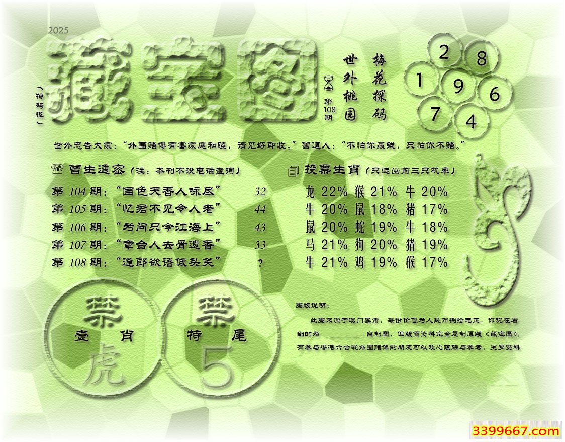 | 主题 :108期藏寶圖 新:云残香瘦春犹可 老:逢郎欲语低头笑 禁:虎 禁:5尾 |