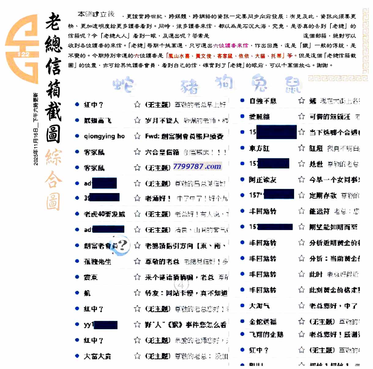 | 主题 :122期:六合皇金句/老总论码/萧公子/林大师/五行夺码/老总信箱截 |