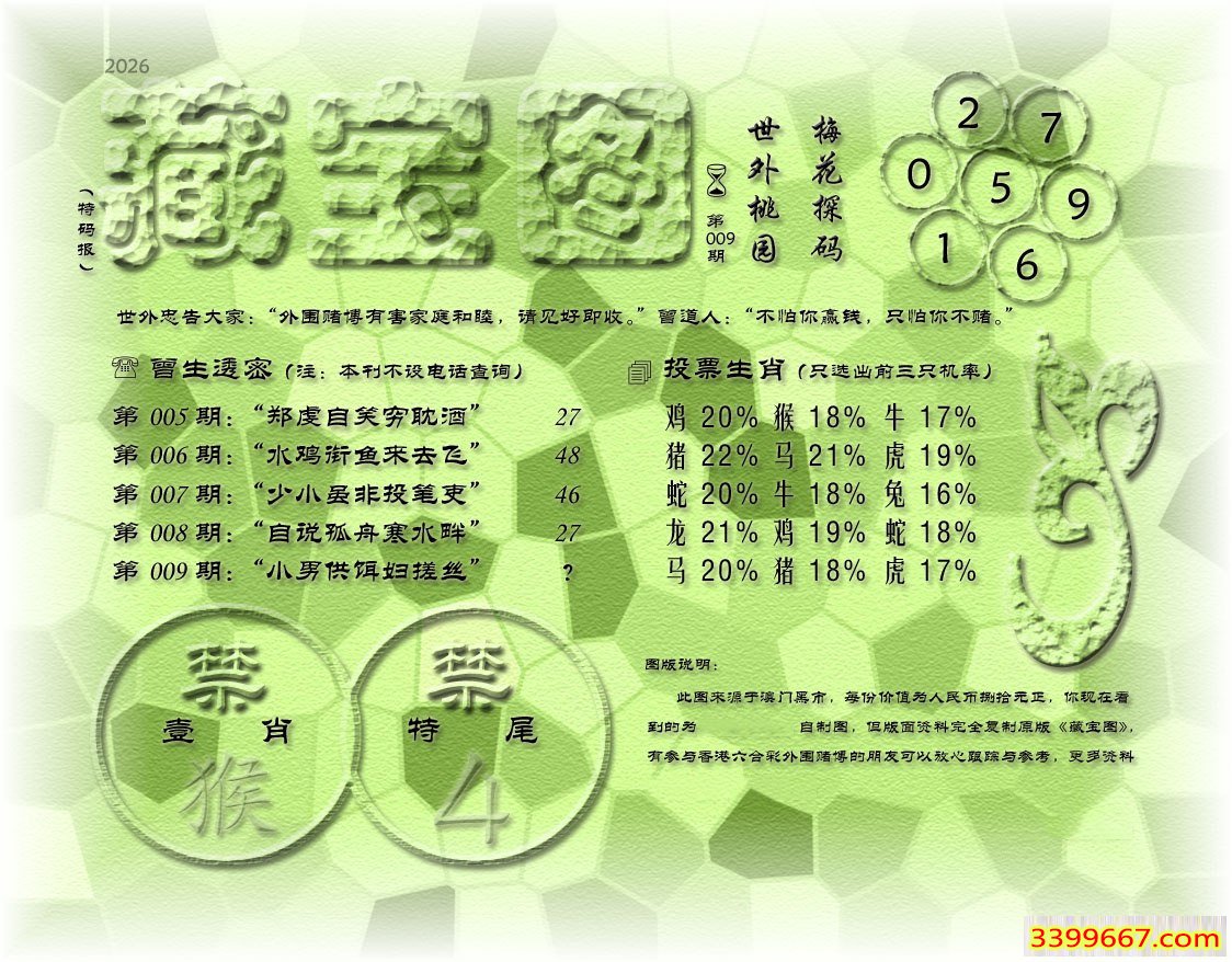 009期藏寶圖 新:吊屈谁知特怆神 老:小男供饵妇搓丝 禁:猴 禁:4尾 玄機字:《醋》