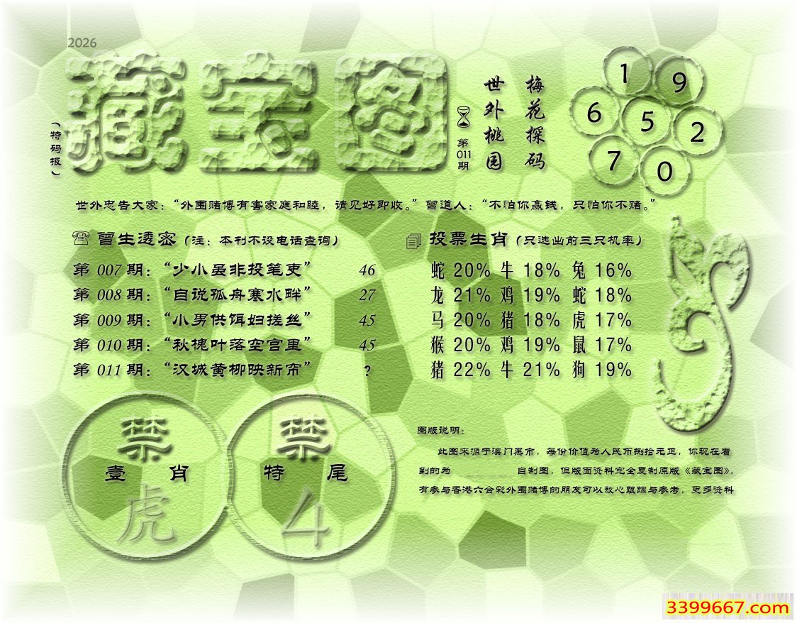 主题 :011期藏寶圖 新:因想后湖题柱处 老:汉城黄柳映新帘 禁:虎 禁:4尾