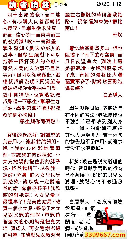 | 主题 :132期:彩民推荐〖貼信讀者論壇〗 |